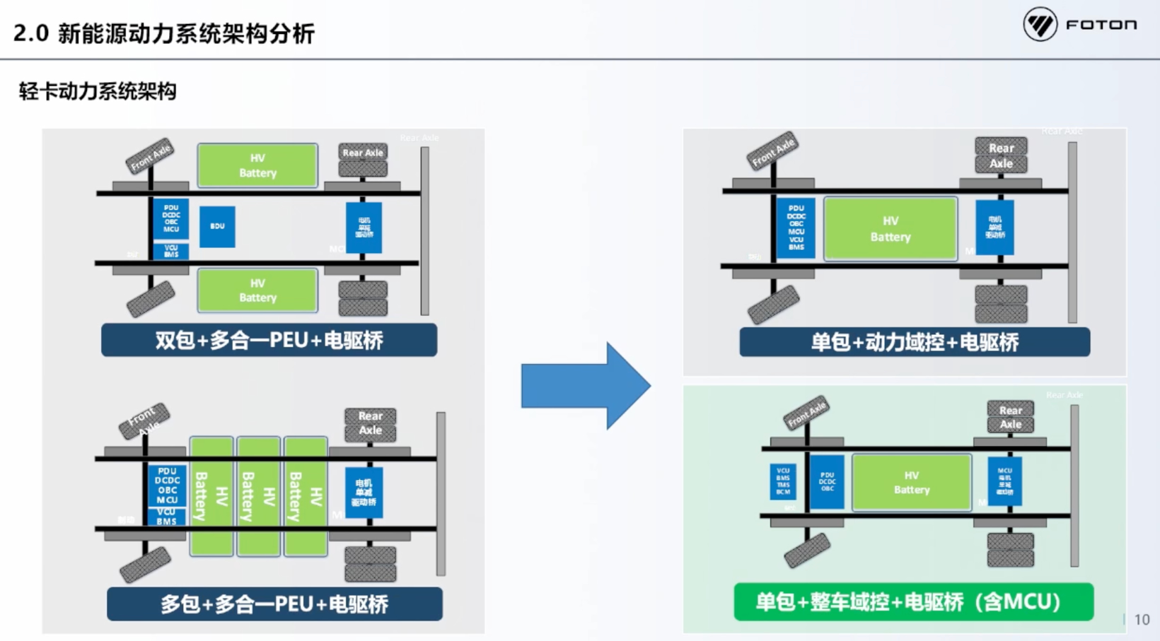 下图左侧展示的是过去轻卡新能源车型的传统架构,每侧配备一个电池PACK。此外,整车控制单元与电池管理单元均为独立设置,动力系统中控制单元较多。
