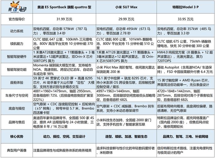 三者相比,特斯拉Model 3 P的优势项:品牌力、智驾、三电、补能网络;小米SU7 Max的优势项:造型、续航、加速、智能生态;而奥迪E5旗舰quattro型的优势项:动力、操控、空间、交互设计。