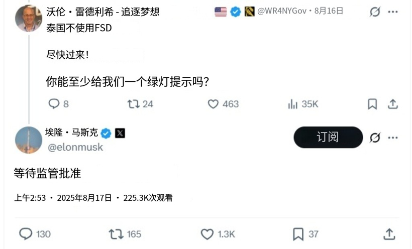 同时,马斯克也透露,FSD 在泰国的落地工作也正在推进中,现在在等待当地监管部门的审批结果。