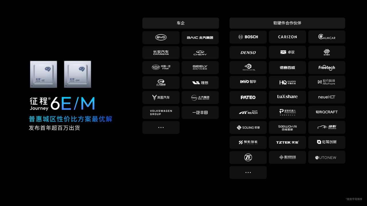 众所周知,我们在中算力J6E/M这一档的芯片,已经成为今年行业里面的爆款,一系列车企都已经成为我们的客户,并且有博世、酷睿程、卓驭、德赛、福瑞泰克等一系列非常广泛的合作伙伴,跟我们紧密地合作在一起。