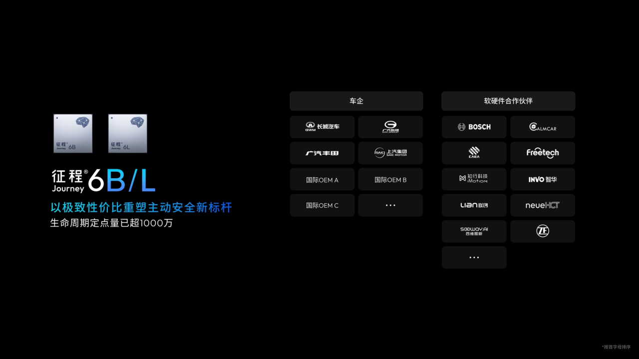 其实,我们在这些年里跟在座各位其实形成了一个非常广泛的,可以说是在中国业态下最广泛的智能驾驶的合作生态。单单只是在发布J6B的这一年时间里面,整个J6 family这一代就已经构建了一个坚实的生态。比如说,我们面向smart camera ADAS、基础ADAS、极致性价比提供的J6B/L,已经与包括国际车企在内,面向全球市场的一系列车企合作。同时我们与博世等合作伙伴的合作,也非常成功。