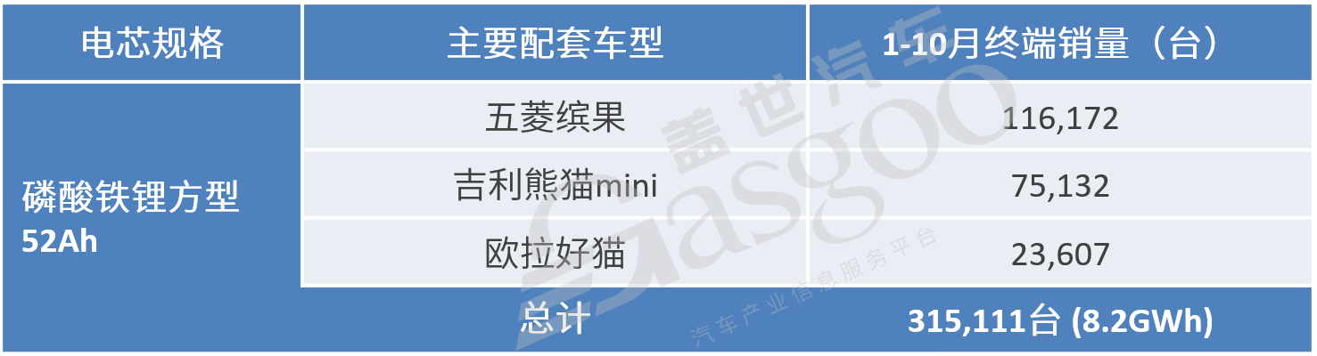 目前国轩高科出货量最大的动力电池是磷酸铁锂方型52Ah电芯,主要配套五菱缤果、吉利熊猫MINI、欧拉好猫等车型。