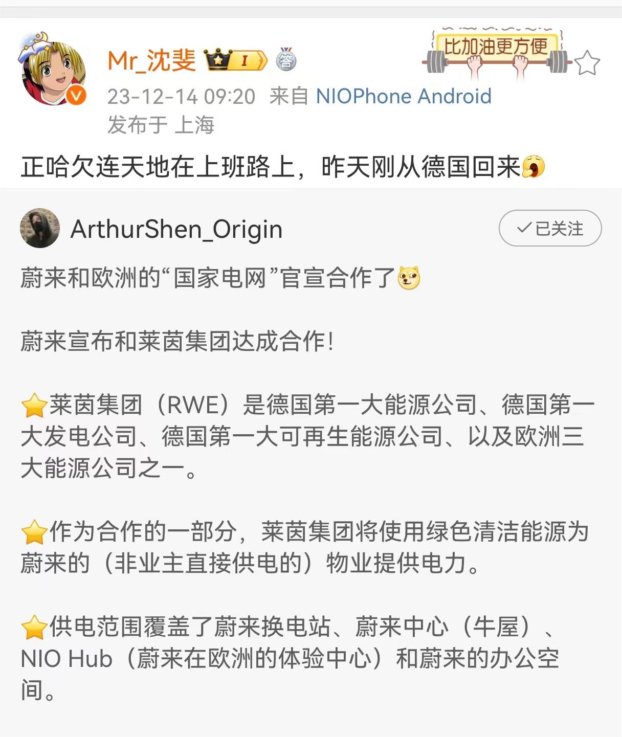 对此,蔚来副总裁沈斐在微博发文:“正哈欠连天地在上班路上,昨天刚从德国回来”,并表示“欧洲的换电站做起来更辛苦,大家管理下期望值,我们还在积攒力量。”